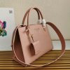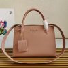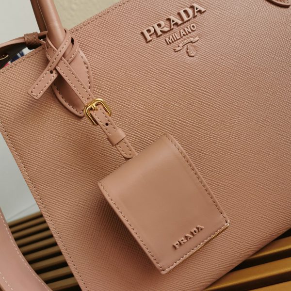 The Prada Monochrome bag, crafted from Saffiano leather, is uniformly colored and highlighted with a metal lettering logo. Saffiano leather, an iconic material for Prada, symbolizes luxury and is synonymous with the traditional craftsmanship of Italian leather goods. This high-quality premium leather is characterized by its distinctive crosshatch texture and waxed finish.