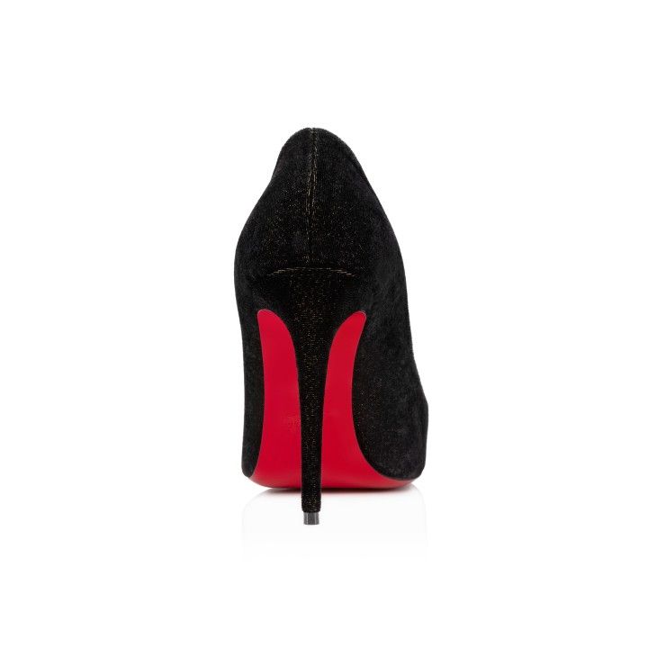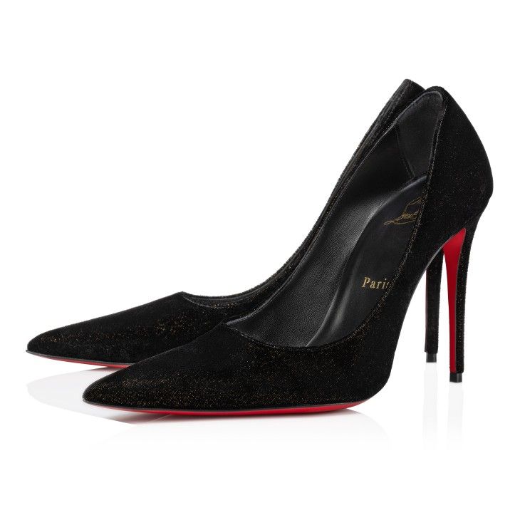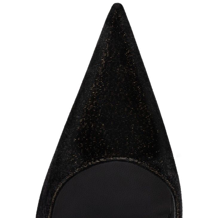 Christian Louboutin Kate Max 100 Mm Pumps Velvet D’Or Black feature elegant lines and characterises Maison Christian Louboutin’s ‘savoir-faire’. It showcases a pointed toe and signature low-cut vamp, to audaciously reveal the foot. Crafted entirely in black-gold velour, this sophisticated pump sits on a 100 mm heel.