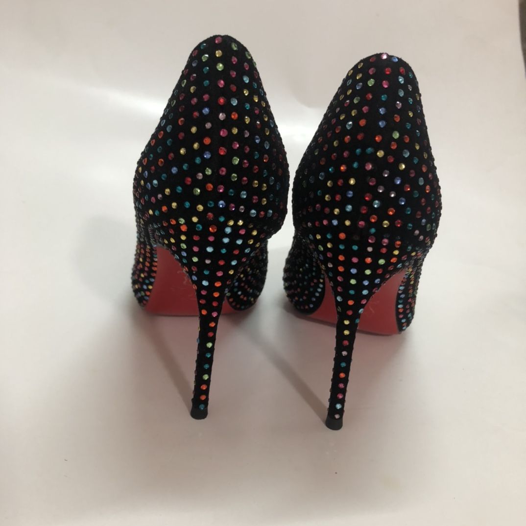 Christian Louboutin Kate Strass Pumps Suede Crystal Embellishments Multicolor with rainbow-hued crystal embellishments. The suede pair is set on 65mm/80mm/100mm/120mm heels and has pointed toes.