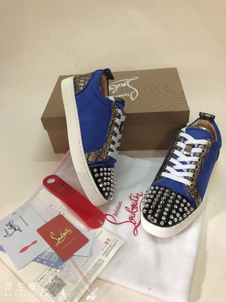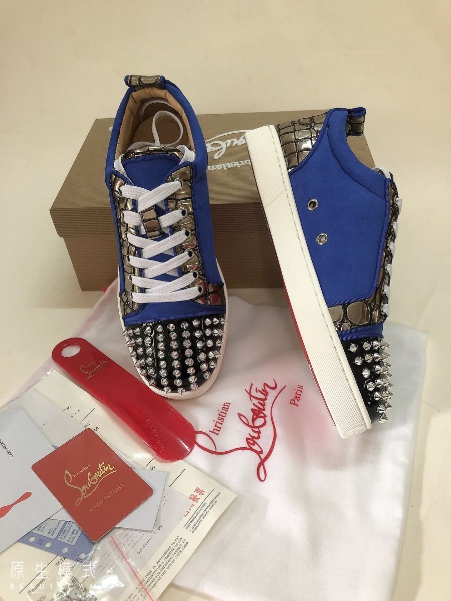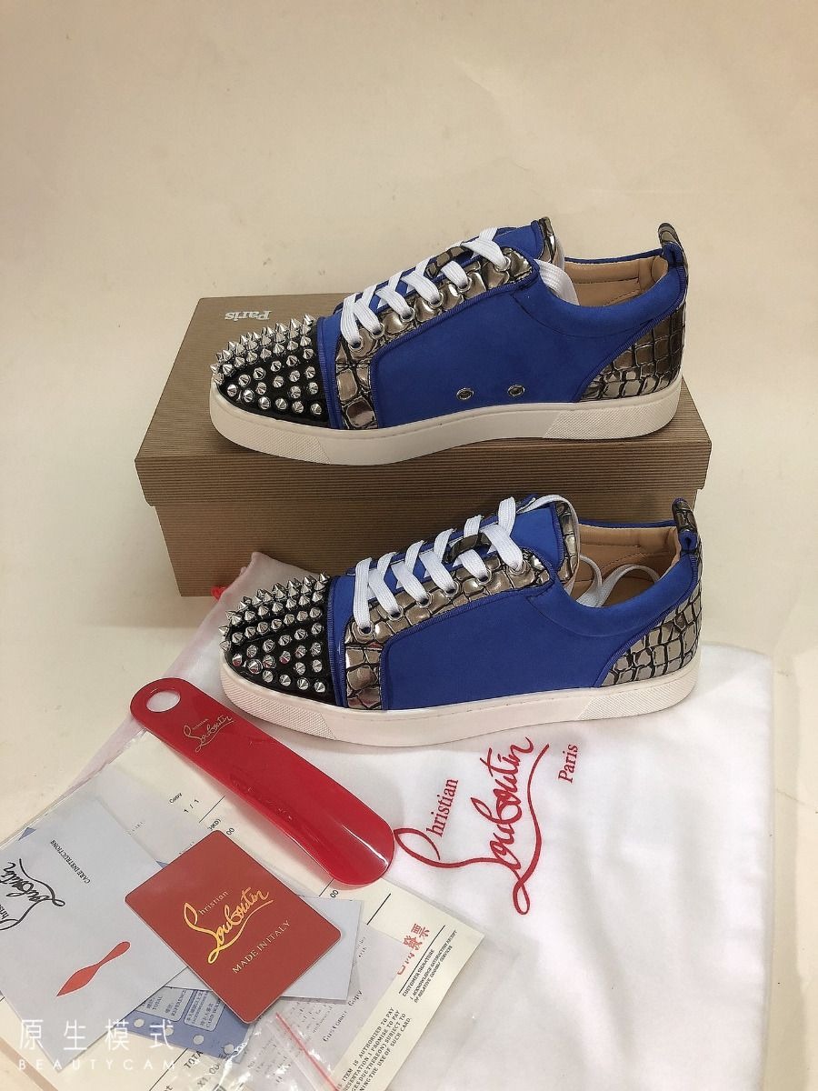 Christian Louboutin Louis Junior Spike Low Top Sneakers Leather and Veau Velours Blue