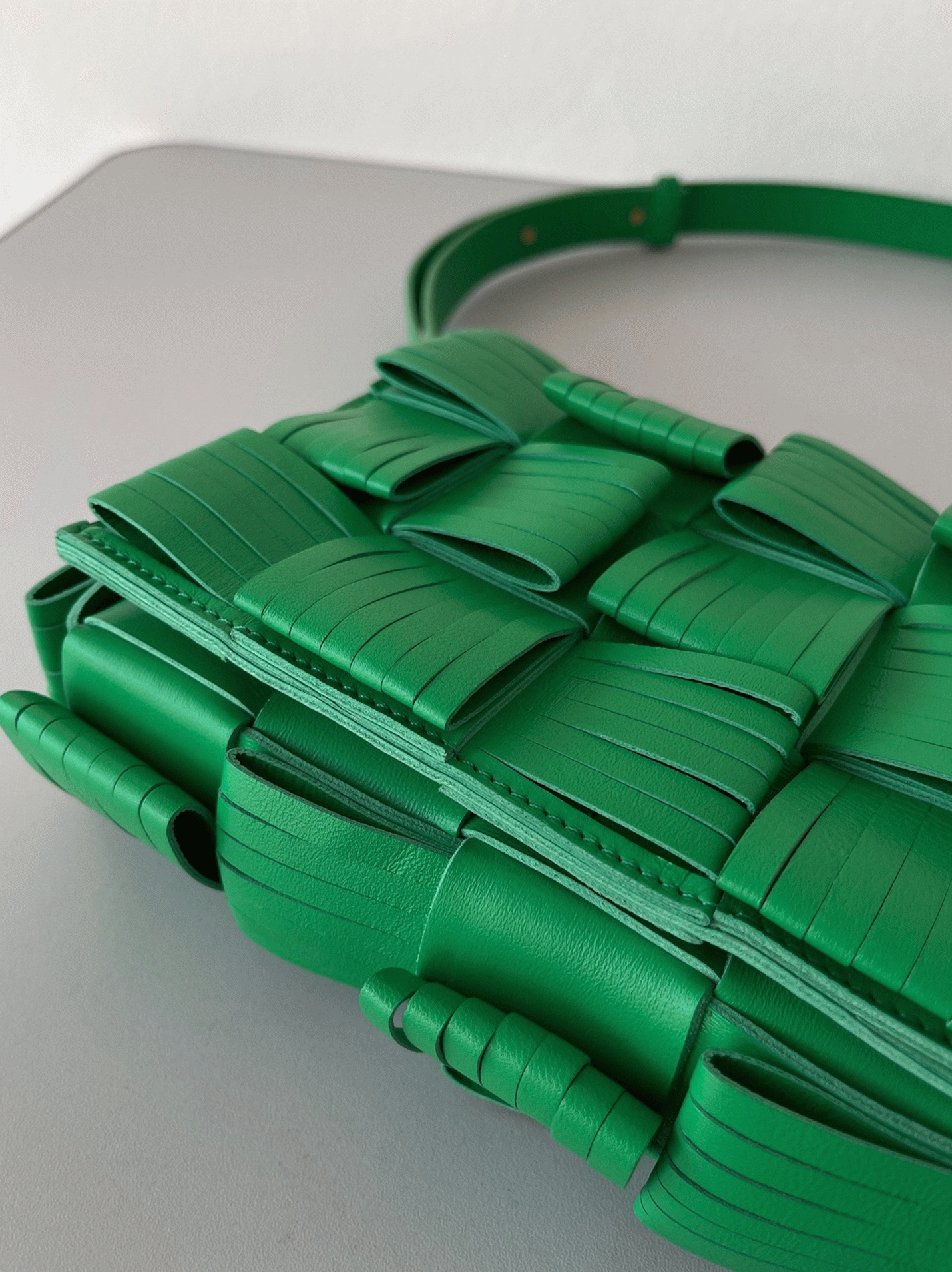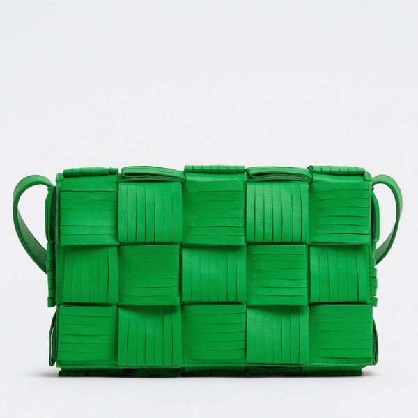 Bottega Veneta has increased the proportions of the iconic weave in the Cassette Bag. This version features the iconic weave of the house embellished by fringed strips nappa. The bag has a slim silhouette and a mid-sized shape. It is spacious enough to hold everything from keys, wallets, and makeup.
