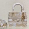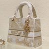 This medium Lady D-Lite bag offers versatile carrying options with its wide, reversible, and removable embroidered shoulder strap. It can be gracefully carried by hand or worn crossbody, adapting to various styles and occasions. The interior features practical elements, including a zip pocket and a large patch pocket, ensuring organized storage for everyday essentials. Additionally, the bag’s design allows for personalization, as it can be paired with different embroidered straps to match individual tastes and preferences.