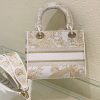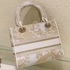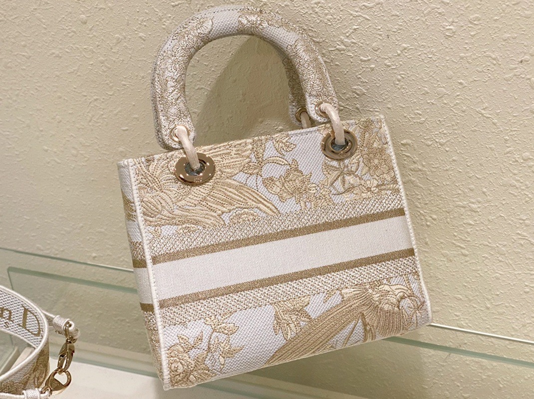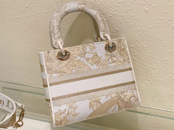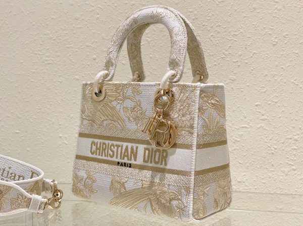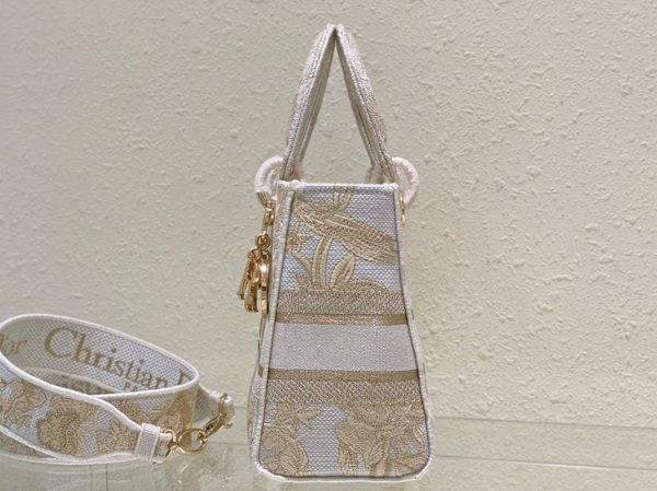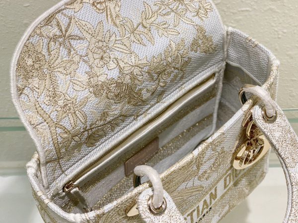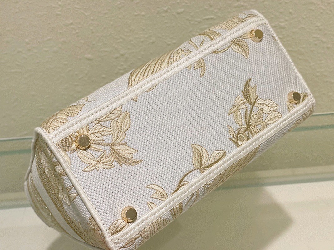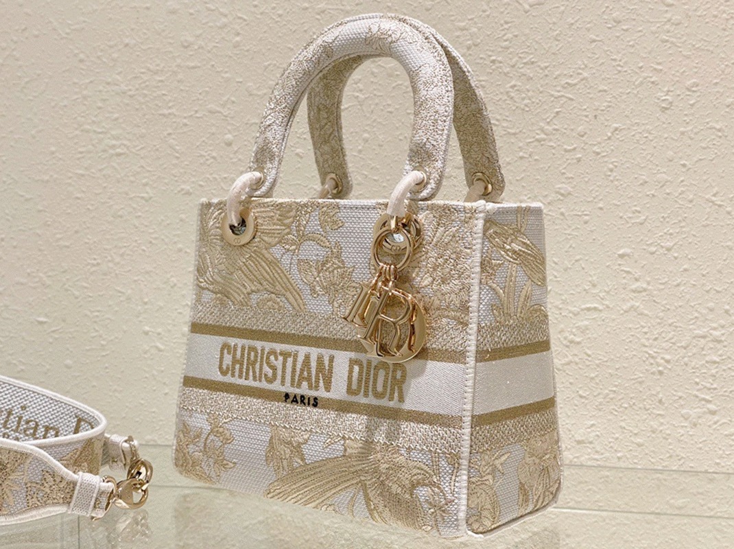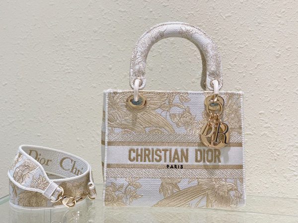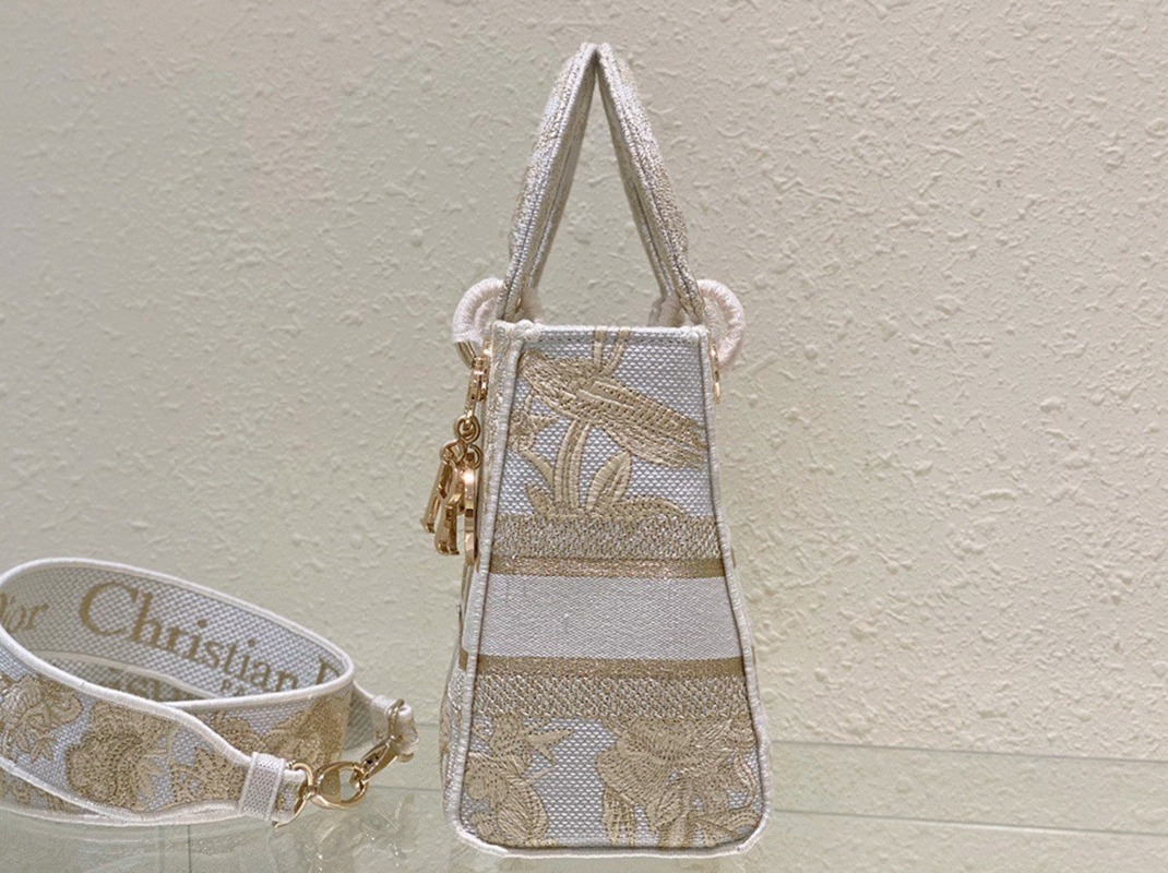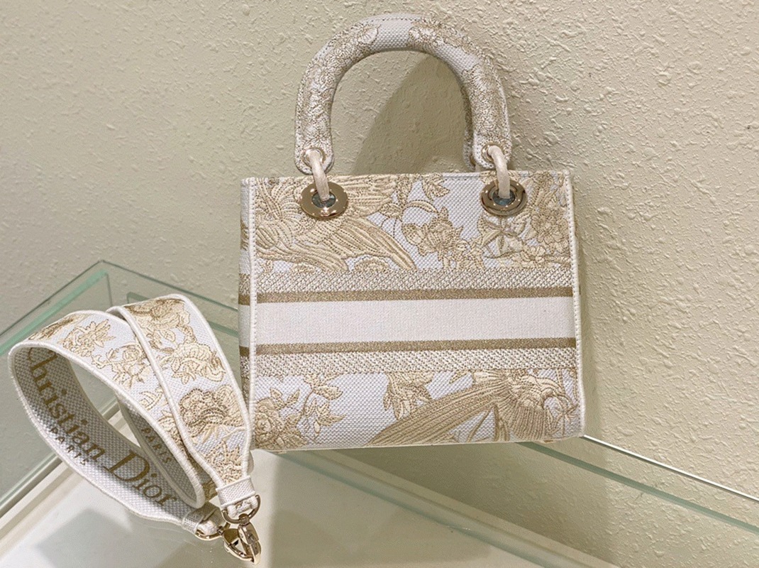 The Lady D-Lite bag seamlessly blends classic elegance with the modern essence of the House of Dior. It is exquisitely embroidered with the Dior Jardin d’Hiver motif in gold-tone metallic thread, presenting a poetic and exotic reinterpretation of Mr. Dior’s cherished wall tapestries. The front proudly displays the ‘CHRISTIAN DIOR PARIS’ signature, while ‘D.I.O.R.’ charms in pale gold-finish metal add a refined touch to the silhouette.