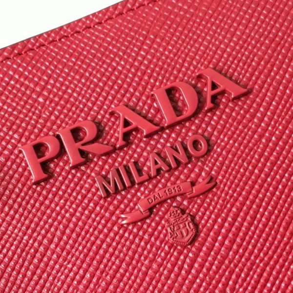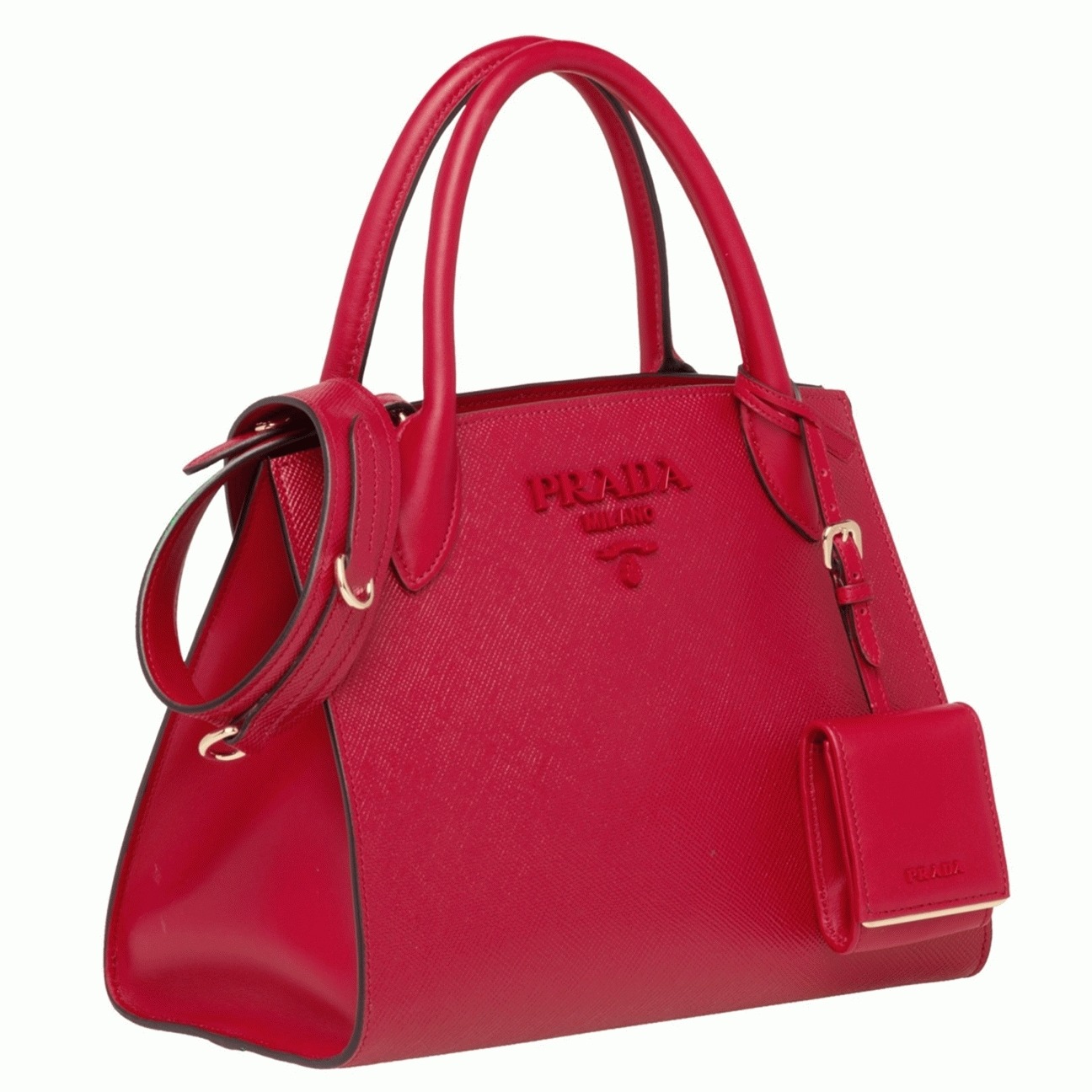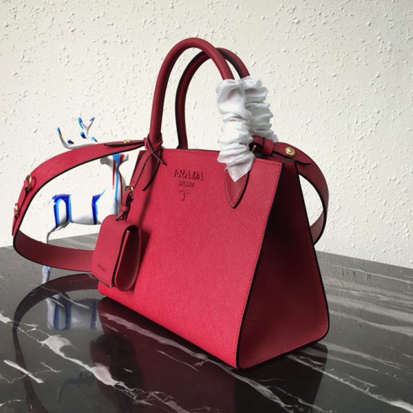 The Prada Monochrome bag, crafted from Saffiano leather, is uniformly colored and highlighted with a metal lettering logo. Saffiano leather, an iconic material for Prada, symbolizes luxury and is synonymous with the traditional craftsmanship of Italian leather goods. This high-quality premium leather is characterized by its distinctive crosshatch texture and waxed finish.